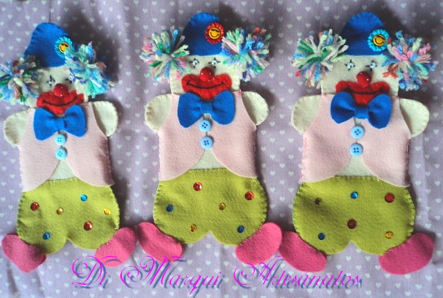 Eu fiz palhacinhos (usei o mesmo molde do fantoche, mais só a cabeça) imã de geladeira, mas você também pode fazer chaveiro.